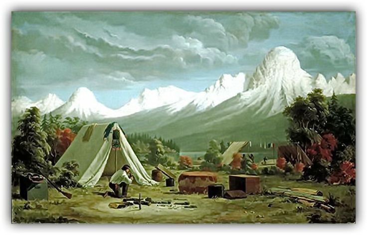'Boat Encampment' by Canadian artist Paul Kane. Painted while travelling with a HBCo fur brigade - Sept 22, 1847, Kane with canoe brigade up the Columbia River and arrived on October 10 at Boat Encampment. [near Rockies on Alberta/BC border] They waited until horse trek from Jasper arrived. Then they switched, the horse team taking over the canoes. They managed to bring all 56 horses safely and without loss to Jasper's House [Alberta]. Pinterest by RobinBodnaruk.